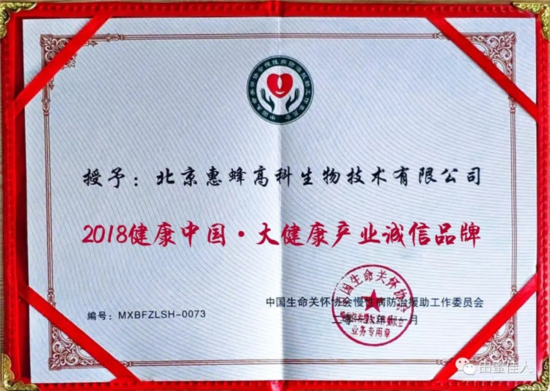 北京惠蜂董事長倪仔鑫上臺領獎 會議期間,北京惠蜂被中國生命關懷慢性病防治援助工作委員會授予“2018健康中國·大健康產業(yè)誠信品牌”